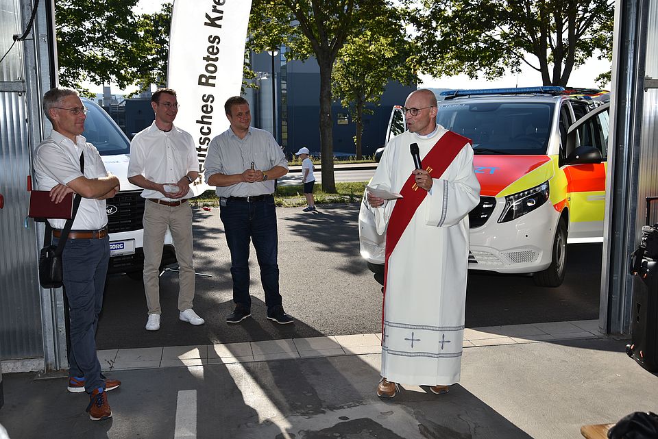 Diakon Dr. Kai Witzel segnete die beiden neuen Fahrzeuge und hob hervor, dass es trotz der hohen Qualifikation der Mitarbeitenden und der ausgeklügelten technischen Ausstattung immer noch auf die Menschen ankommt, die Hilfe leisteten.